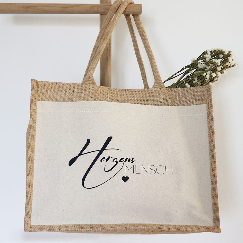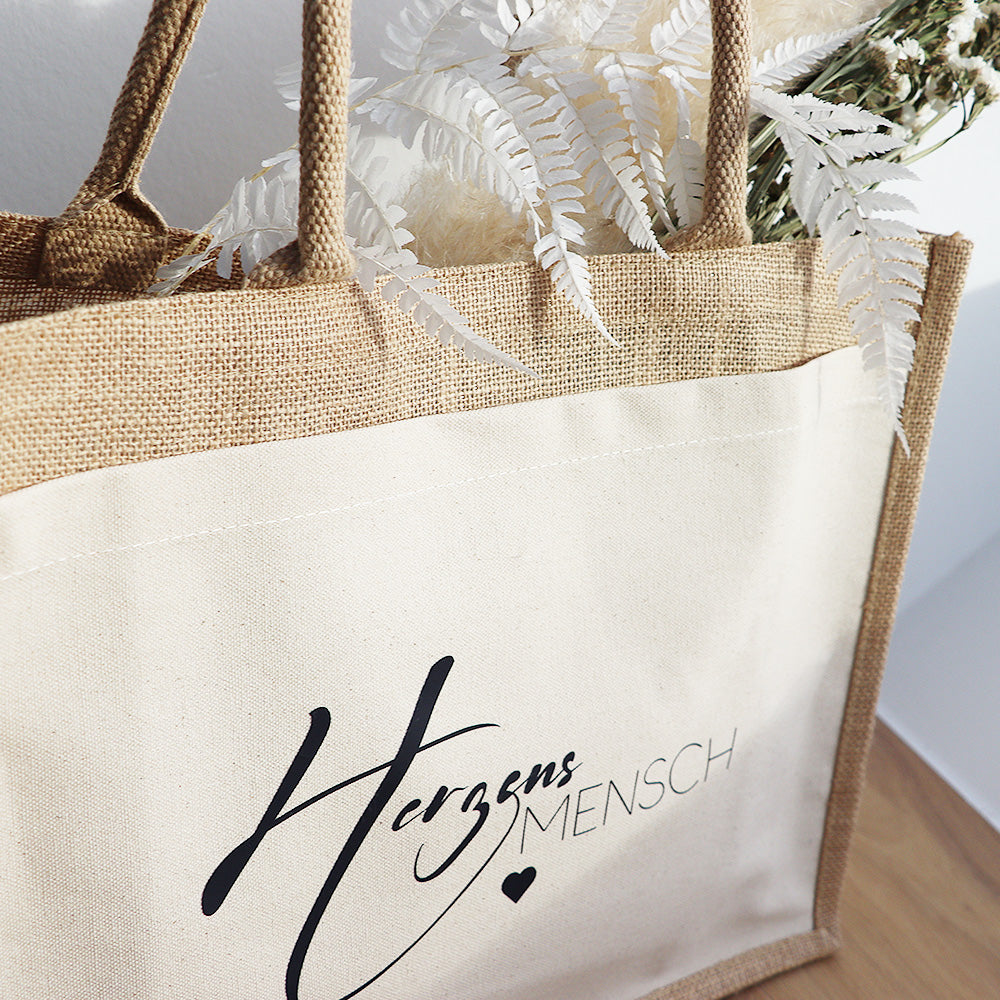 Du erhältst die Jute Tasche mit der Aufschrift "Herzensmensch" oder personalisiert nach deinen Wünschen. Die Tasche ist aus natürlicher Jute und innen beschichtet. Außerdem kannst zwischen Groß und Klein auswählen.